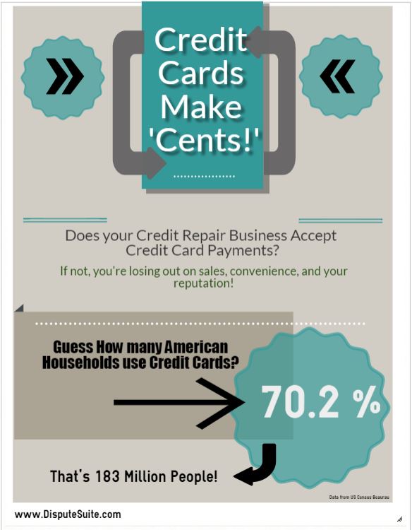 According the US Census , 70.2% of all American Households possess and use credit cards. That equals out to be 183 Million people! Most Americans feel inconvenienced when forced to pay with alternative methods of payment. Credit Repair can be uncomfortable enough for your customers. Make it easy on them… and you!