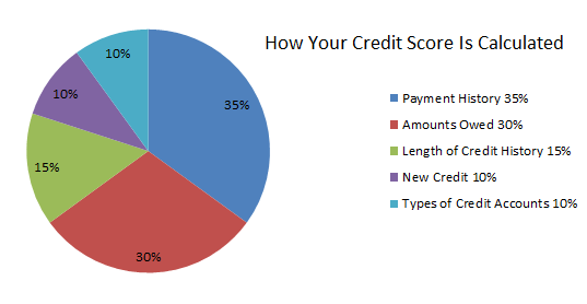 score falls neatly into 5 categories; payment history, indebtedness, age of credit history,