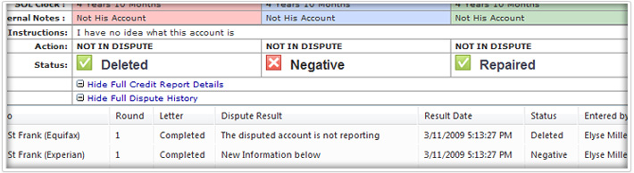 Within the customer’s credit report, each credit report item is color-coded making it easy to identify which items have been repaired, deleted, or are still negative. That way you can easily identify what has been repaired and deleted and what still needs to be disputed. Under each credit report item there is a full dispute history. You can see an itemized list of when the item was disputed, who it was disputed with, and the results of the dispute, right in the credit report! You can even print preview every dispute letter used.